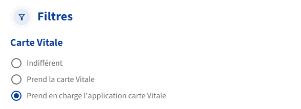 Le filtre n’apparaît que s’il existe des professionnels de santé qui acceptent l’application. S’il n’est pas affiché, cela signifie qu’aucun praticien de la liste ne prend en charge l’application carte Vitale.